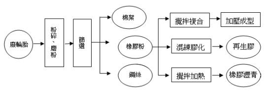國內每年產生約十萬公噸之廢輪胎,大多未能妥善回收再利用,成為病媒蚊孳生的溫床,嚴重危害國人的健康,本技術即運用經濟部科技專案計畫與工研院化工所合作開發,將廢輪胎回收再生成為橡膠瀝青道路、再生膠及橡膠地磚等各項產品,除解決環境污染問題外,並為廢棄物開創高附加價值之效益。