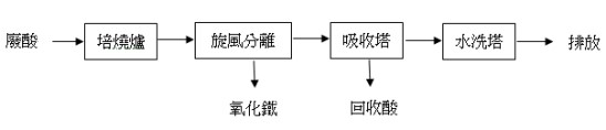 鋼鐵業在酸洗過程中會產生相當大量的廢酸,其廢酸中含有高濃度的鐵份,故可利用燒培的方式回收酸外亦可獲得純度高的氧化鐵,供業界製造磁化鐵的原料。