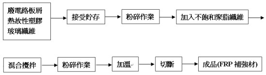 廢電路板屑利用者為一生產強化FRP補強材之化工廠。廢電路板屑主要加入熱固性樹脂及玻璃纖維複合拉擠成型,藉由同性質之基材餘料加上新的樹脂及過氧化合物,以達補強效果。再資源化過程如下: