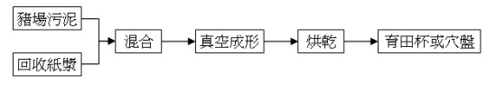 豬場糞尿經廢水處理後所產生的污泥數量龐大,若逕行掩埋處置易造成環境的負擔。本技術利用回收廢紙與污泥混合,再藉由成型設備將其製成育苗杯或穴盤,其中紙纖維提供育苗杯或穴盤的支撐力,而污泥則提供種苗所需之養份,待種苗長大後可直接植入土中,紙纖維及污泥均可分解不會造成二次污染。