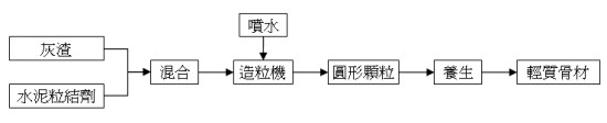 造紙業的紙渣污泥經焚化後其灰渣具有質輕、鬆散及顆粒細的特性。在灰渣中添加水泥粘結劑利用造粒機在適當的水份下可以製造圓形顆粒,此顆粒質輕、單粒強度大於20kg以上,可做為代替礫石用於混凝土。